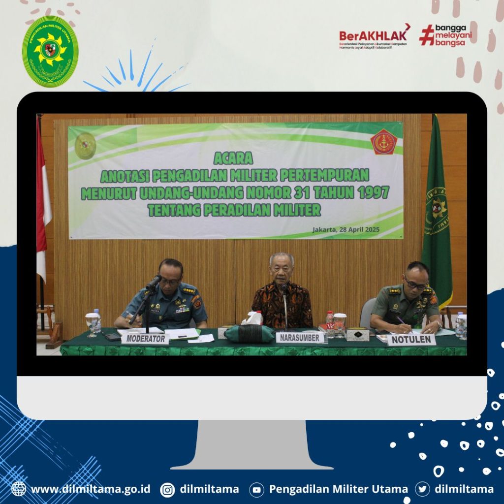 Pengadilan Militer Utama menyelenggarakan Acara Anotasi Pengadilan Militer Pertempuran Menurut Undang-Undang Nomor 31 Tahun 1997 tentang Peradilan Militer, dengan Narasumber Dosen STHM Ditkumad Kolonel (Purn) Jacob Luna Sumuk, S.H.