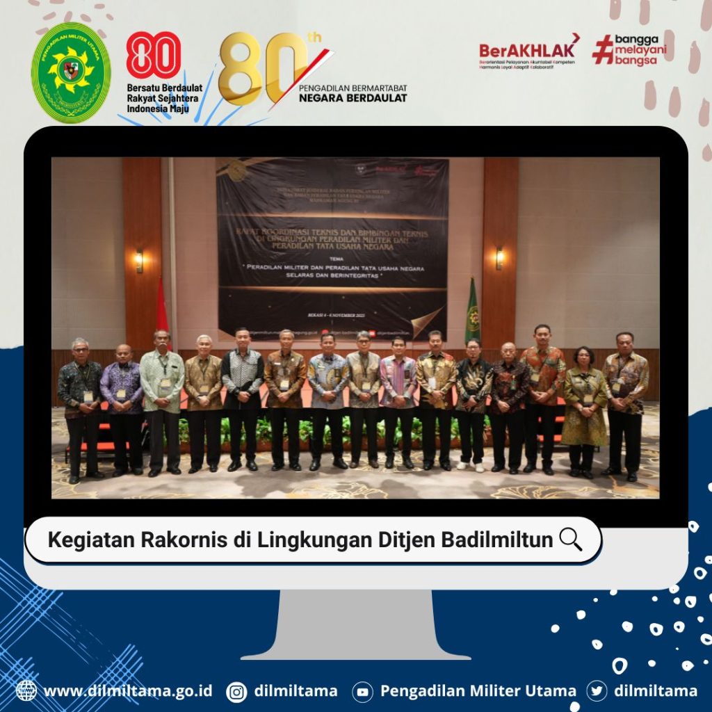 Kegiatan tersebut dipimpin langsung oleh Dirjen Badilmiltun MA RI Marsda TNI Dr. Yuwono Agung Nugroho, S.H., M.H. dengan Tema Kegiatan “Peradilan Militer dan Peradilan Tata Usaha Negara Selaras dan Berintegritas” Pada kesempatan tersebut juga diselenggarakan Kegiatan Pemberian Apresiasi Bidang Pelayanan Informasi Publik di Lingkungan Peradilan Militer oleh Ditjen Badilmiltun MA RI.