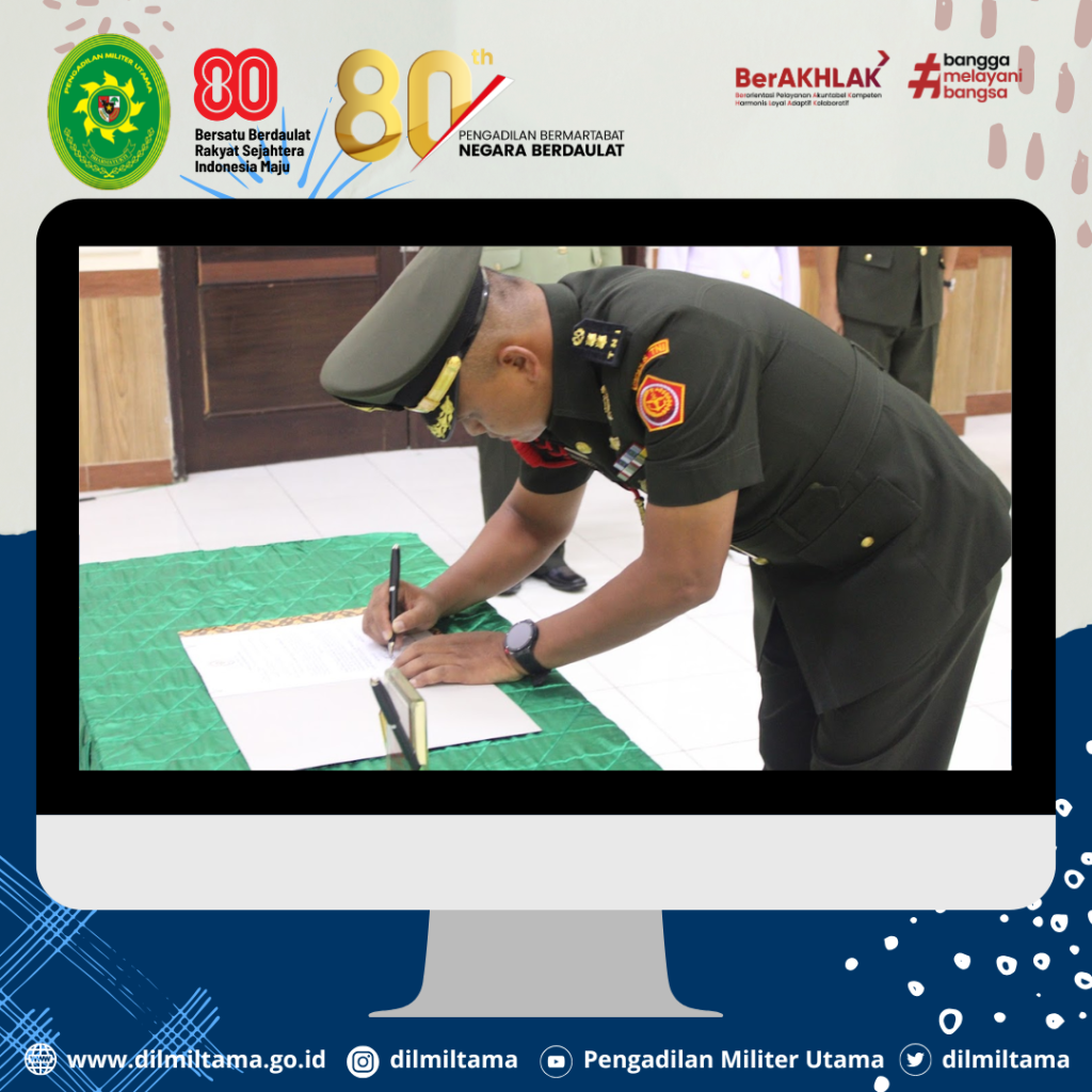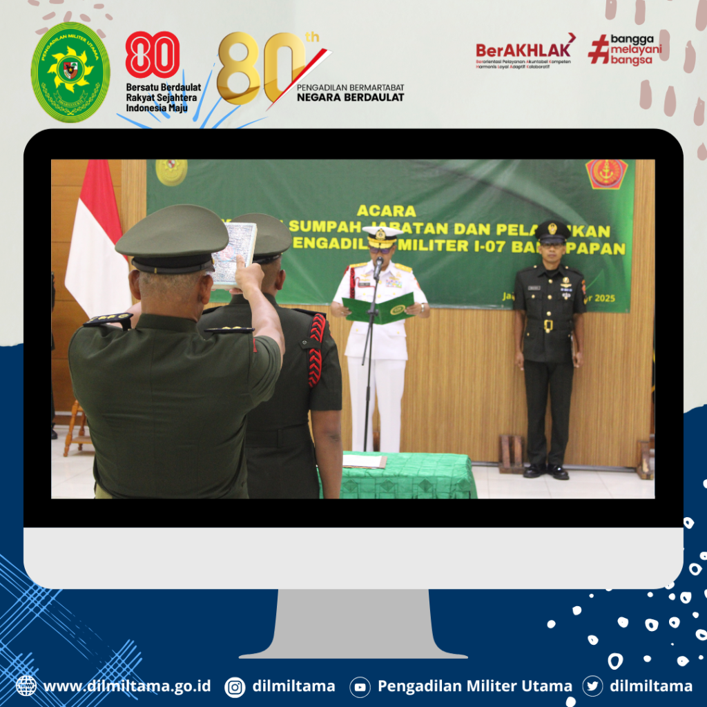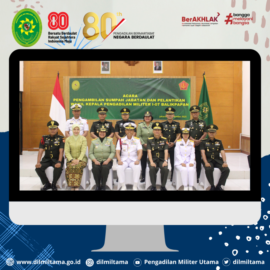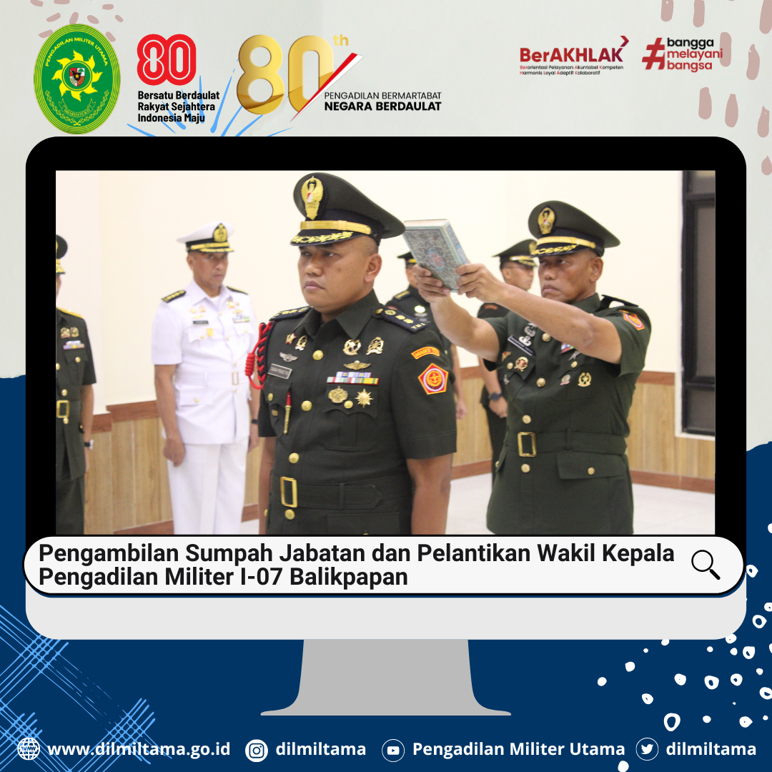 Bertempat di Ruang Sidang Utama Pengadilan Militer Utama, Kepala Pengadilan Militer Utama Laksamana Muda TNI Ismu Edy Aryanto, S.H., M.H. memimpin Acara Pengambilan Sumpah dan Pelantikan Wakil Kepala Pengadilan Militer I-07 Balikpapan. Dalam kesempatan tersebut, Kepala Pengadilan Militer Utama mengamanatkan untuk berfokus pada reformasi dan birokrasi untuk mencegah korupsi dan meningkatkan kualitas palayanan publik.