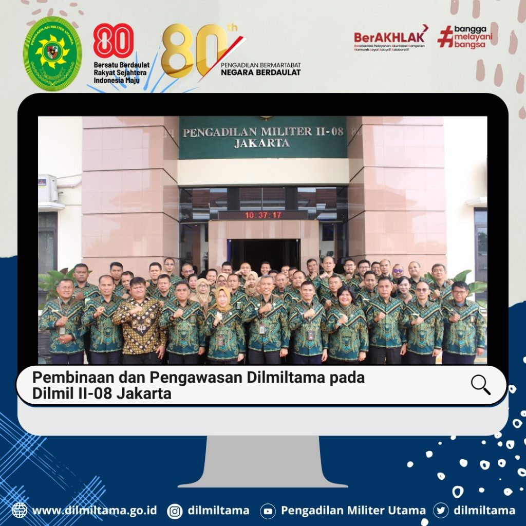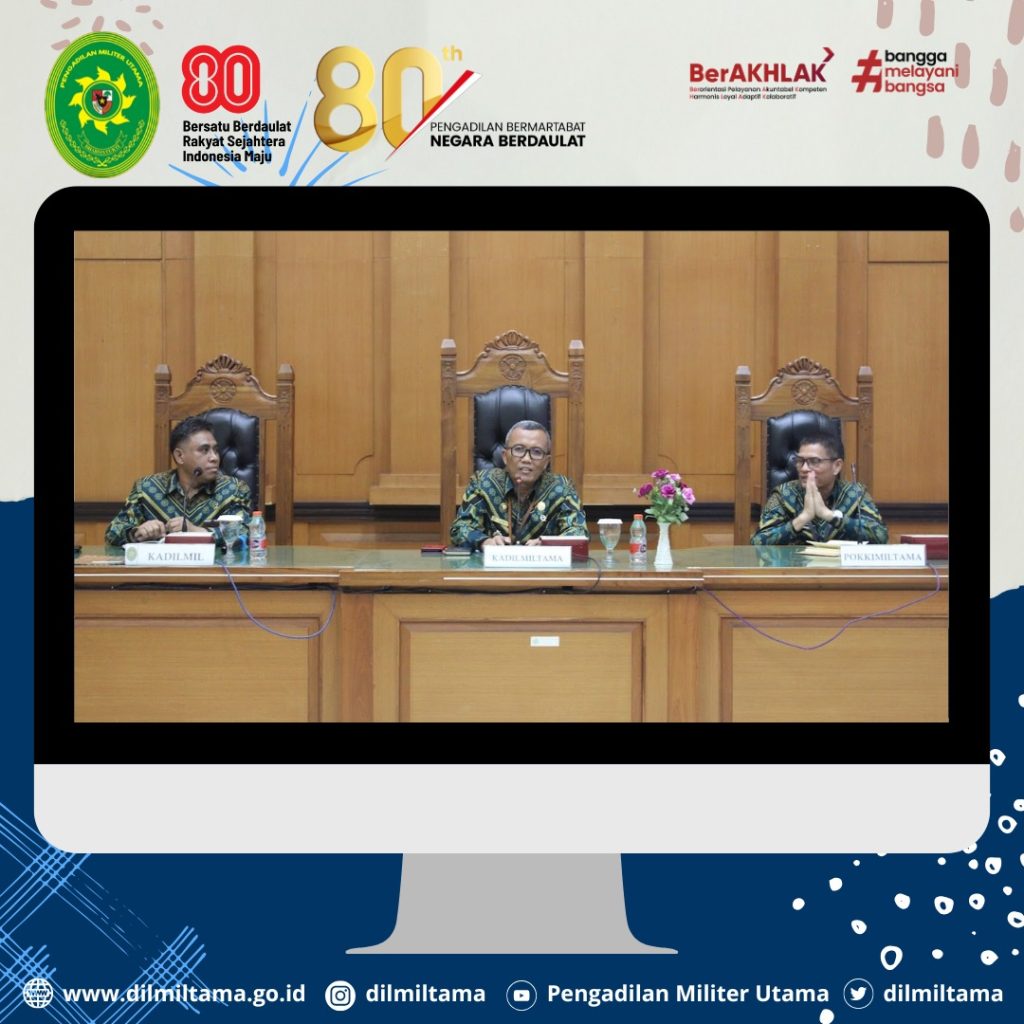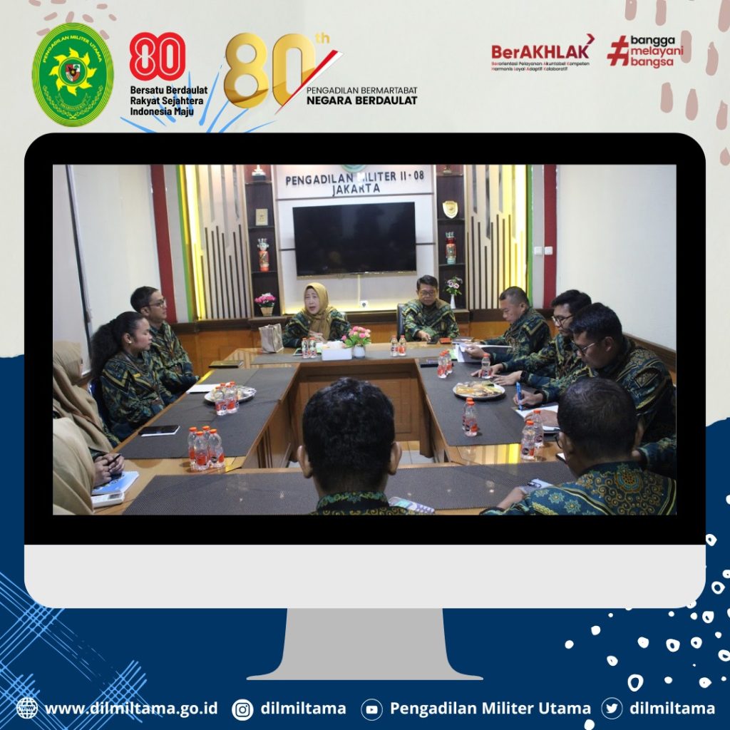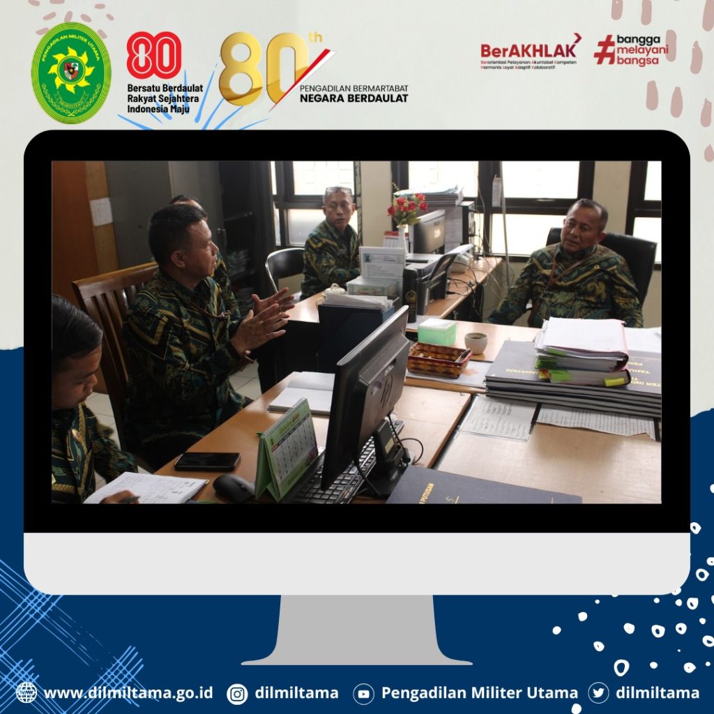Kepala Pengadilan Militer Utama Laksda TNI Ismu Edy Aryanto, S.H., M.H. didampingi oleh Hakim Militer Utama Dilmiltama Brigjen TNI Dr. Esron Sinambela, S.S., S.H., M.H. dan Sekretaris Dilmiltama Nuratiah, S.H., M.H. melaksanakan Kegiatan Pembinaan dan Pengawasan pada Pengadilan Militer II-08 Jakarta.